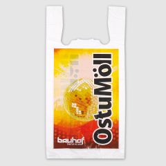 ”T-shirt” Bags (also known as Vest Style Carrier Bags) are a very common type of shopping bag because their load capacity is high while the bags themselves are inexpensive. They are most often used for groceries and other fast-moving consumer goods.